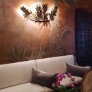 C’est le lieu qui veut ça : les ruelles médiévales d’abord, de ce village du Haut de Cagnes. La bâtisse elle-même, datée du 13e siècle, avec ses escaliers étroits, ses niches et ses recoins chargés d’histoire, sa magnifique Salle des Gardes voûtée où paissent des éléphants, oui oui !, la belle salle du restaurant enfin, avec son plafond en caissons aux 200 panneaux peints à la main ouvert sur le ciel et sur la terrasse panoramique. En prime : la vue sur la Méditerranée… Avec 20 convives pas plus, vous êtes un privilégié !