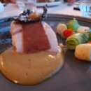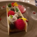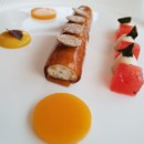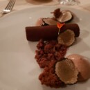 Tables nappées, décorum sobre : le spectacle est dans l’assiette. L’art de la table colle aux mets, depuis ces très originaux cornets fourrés chou rouge, truite et cacahuète jusqu’au dessert chocolat truffé. Mon coup de coeur : un surprenant foie gras à la cerise qui se déroule dans son tapis rouge… Sam, le responsable de la salle – précédemment en poste à la Chèvre d’Or (Eze) – est de bon conseil et gère une équipe aux petits soins mais pas obséquieuse. C’est à lui que je dois de m’être régalée d’un verre de Syrah pour accompagner mon dessert chocolaté. Je cherchais une alternative aux vins doux, trop sucrés à mon goût.
